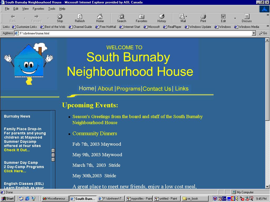 Sbnh, South Burnaby Neighbour Hood House, is located in the beautiful Metrotown Burnaby B.C. Canada. A Neighbourhood House is a volunteer driven community based social service agency that provides programs and services. (Keywords HTML, Javascript) response to identified community needs